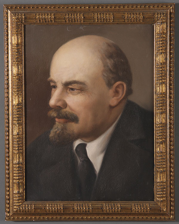 ORIGINAL RUSSIAN SOVIET OIL PAINTINGS OF STALIN AND LENIN, CIRCA 1940S. Oil on canvas, apparently unsigned. 17.5 inches x 13 inches (45 x 34 cm) each. Contained in attractive matching gilt frames.