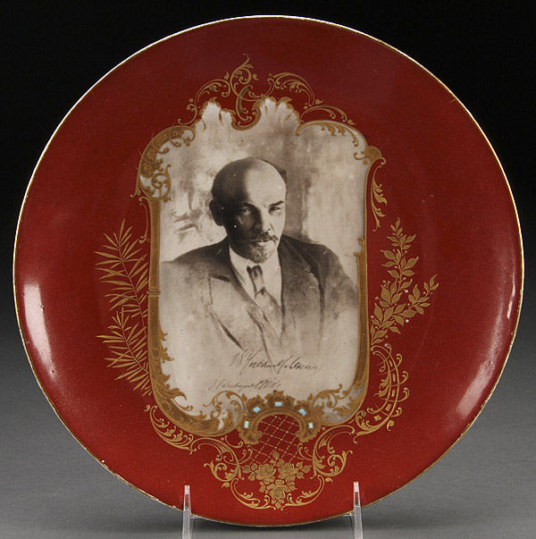 A RUSSIAN SOVIET PORCELAIN PORTRAIT PLATE, CIRCA 1925. The cavetto with a portrait of Lenin in grisaille with facsimile signature and within a framework of raised gilt decoration of scrolling foliage on an oxblood ground with gold rim. Verso with impressed Roman numeral XI and pierced for hanging. 11 inches (28 cm) diameter.
