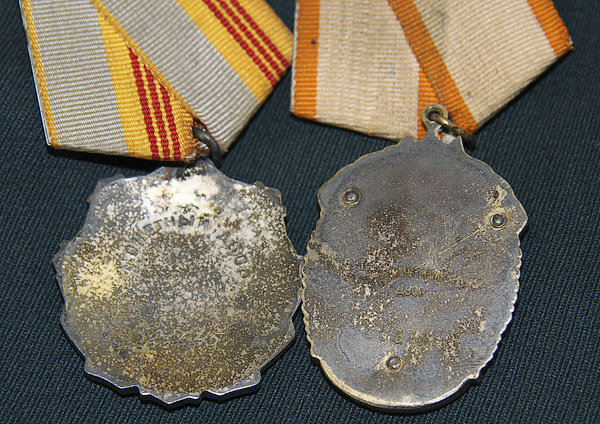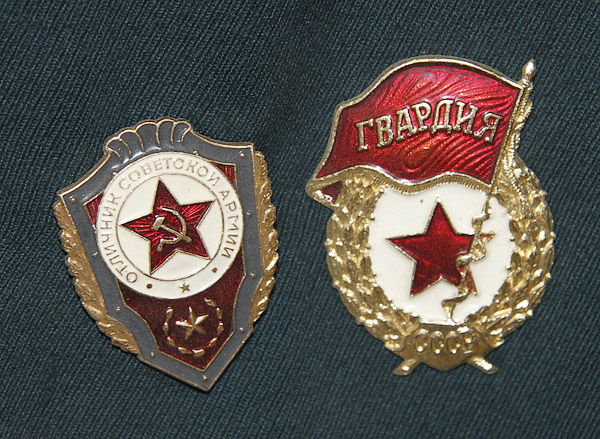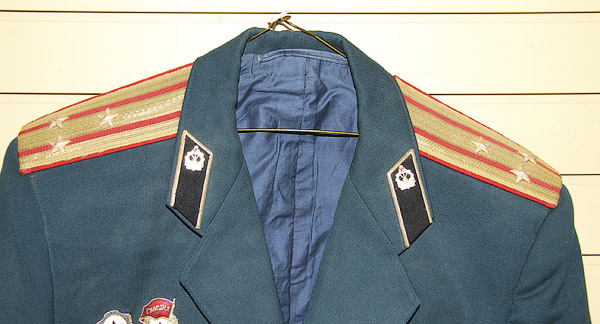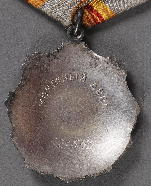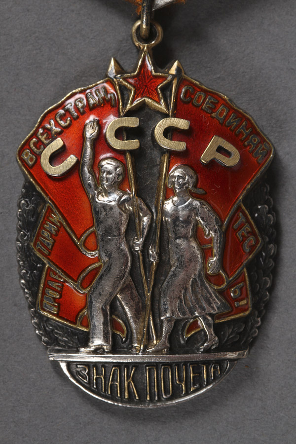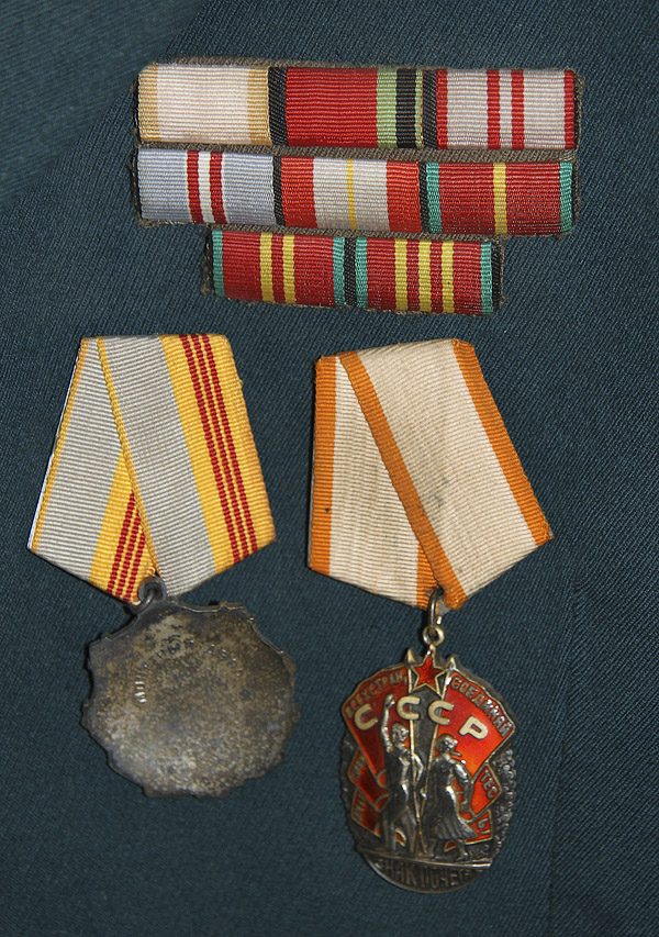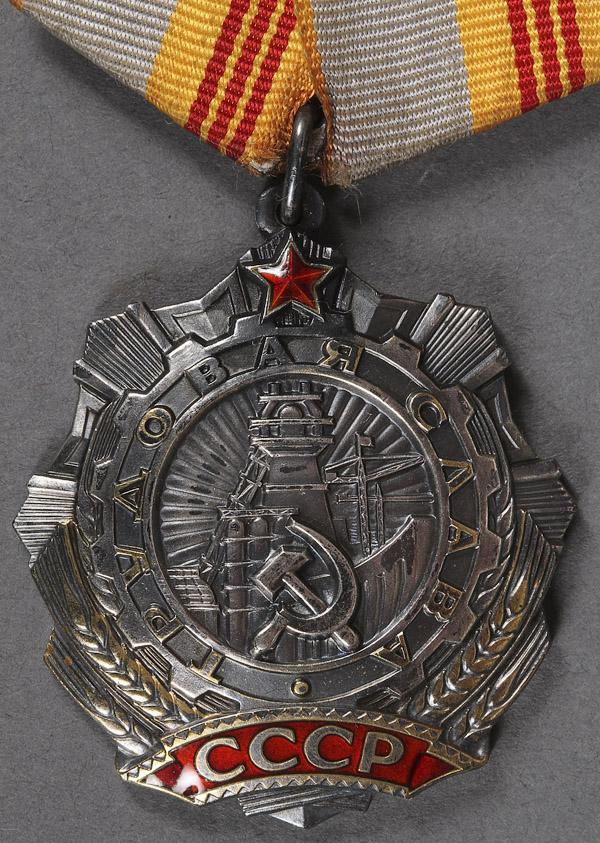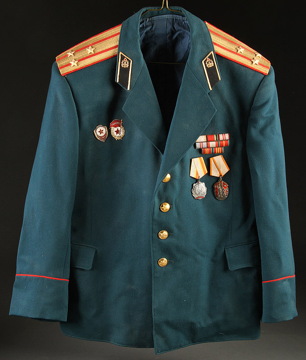 RUSSIAN SOVIET OFFICER'S UNIFORM TUNIC & MEDALS. With medals, ribbon bars and insignia. The two suspended medals include: an Order of Labor Glory, 3rd Class, type 2 - one piece construction. Verso with Monetny Dvor mint mark and engraved with the issuance number 521645, together with an Order of Honor, type 3 flatback, five sided suspension, 2nd variant(?). Verso with Monetny Dvor mint mark and engraved issuance #55377.