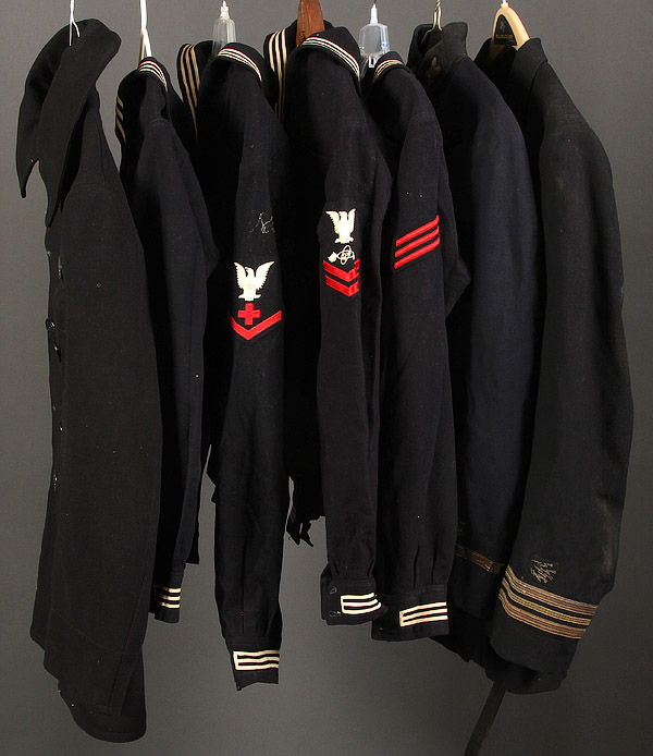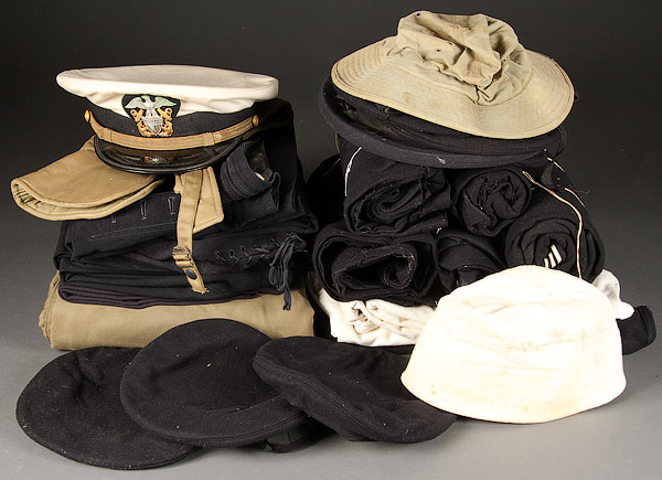 A 35 PIECE GROUPING OF US NAVY UNIFORMS. Including officer's blouses and enlisted men's wool pullovers, pea coat and numerous Navy hats, pants and the like.