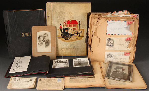 A GOOD US WWII SCRAPBOOK AND EPHEMERA GROUPING. Comprising easily over 500 individual pieces, including five nicely assembled scrapbooks overflowing with photographs, certificates, newspaper clippings, war period correspondence, Western Union telegraphs, personal discharge papers, and numerous loose vintage photographs all WWII related; and including a small archive related to US Naval officer Raymond W. Kimm, who was aboard the USS Utah on December 7th, 1941, his I.D. certificates, etc.