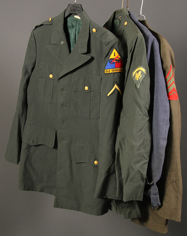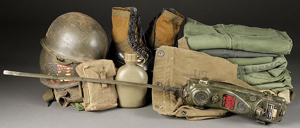 A COLLECTION OF VIETNAM ERA CLOTHING, EQUIPMENT AND HEADGEAR. Including a jungle jacket, four slant pockets with concealed buttons, M56 button front closure, in country name and US Army tapes, CIB and 196th Infantry Bde. sleeve patch, two pairs of OG-107 fatigue shirts/trousers, four 4-pocket dress jackets, a transmitter with Vietnam era replaced antennae, a plastic canteen without cover, an M16 ammo pouch with survival Polarshield emergency blanket, multi-purpose survival tool in camo plastic case, lemon drops, an un-opened safety light stick, a tube of Hexamine tablets, WWII era army boot laces, an M9A1 gas mask bag and two US M1 helmets-- one with nametape on rear "Neufang" and 1970's era airborne liner and two with US flag decal on right side and 1950's era CAPAC liner, and a reversible camouflage helmet cover.