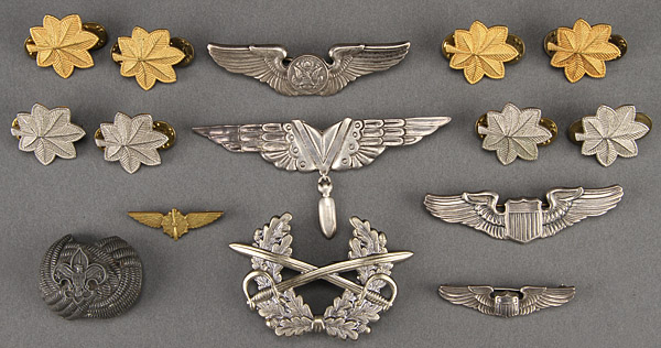 A GROUPING OF US WWII STERLING AIR CORPS INSIGNIA AND MORE. Comprising a pair of sterling pinback Meyer pilot wings (3 inches), a pair of sterling 3 inch Air Crews wings, A.E. Co. Utica, NY, a pair of 2 inch sterling AMICO pin back pilot wings, a pair of 1.5 inch gilt pinback flight engineer wings, a wonderful sterling silver "V" for Victory sweetheart bombadier wings, Mexican sterling halmarked Hector Aguilar (4 inches); and three sets of Meyer clutch back Lt. Col. rank insignia and two pairs of Meyer Maj. insignia. Also a West Germany cavalry cap shako and a Boy Scout neckerchief slide.