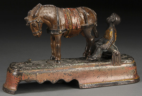 AN "ALWAYS DID 'SPISE A MULE" CAST IRON MECHANICAL BANK, CIRCA 1900. With red polychrome base and yellow shirted figure. Embossed 1897 patent mark, needs repair to function. Length 10 inches (25 cm).