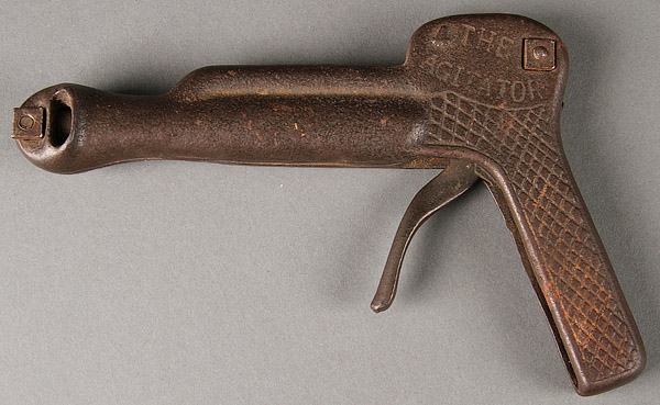 AN EARLY CAST IRON CAP GUN "THE AGITATOR" BY JOHN FOX CO. OHIO, CIRCA 1910. Reservoir for pellet type caps, appears functional, patent date 1910. Length 7.5 inches (19 cm).