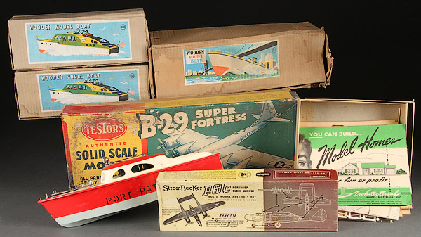 A VINTAGE MODEL TOY AIRPLANE AND WOODEN BOAT GROUP, MID 20TH CENTURY. Eight pieces all contained in original boxes comprising four Rico Japan wooden model boats, length 10 inches and 14 inches; a Testors wooden B-29 bomber; an Ideal Spanish Galleon; a Strombecker P-61 C Black Widow (mostly incomplete) and a one quarter scale architectural model home.