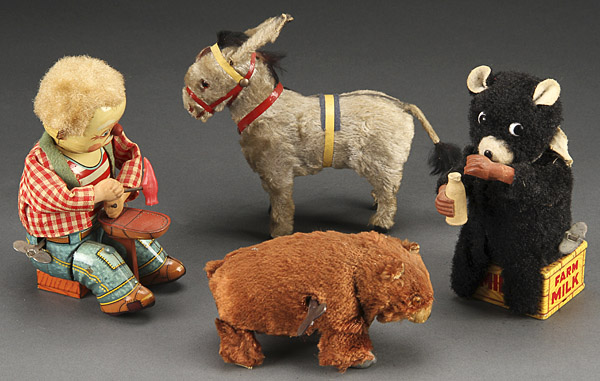 FOUR VINTAGE WIND-UP TOYS, FIRST HALF 20TH CENTURY. Comprising a mohair animated donkey (possibly unmarked, Germany), a seated animated cobbler, a bear drinking milk and a walking brown bear. The latter three marked Japan. The largest length 6.5 inches (16.5 cm).