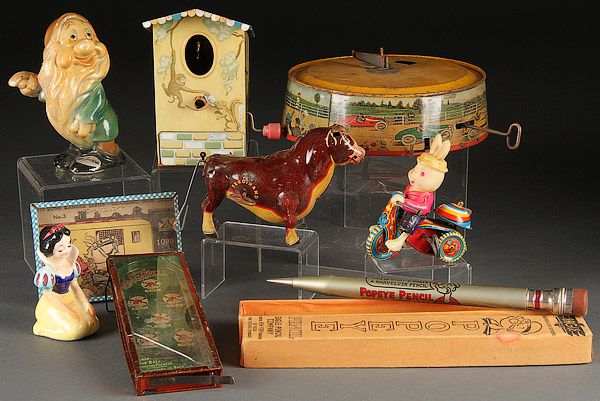 A VINTAGE TIN PLATE AND CHARACTER TOY GROUP, EARLY TO MID 20TH CENTURY. Nine pieces comprising a Popeye pencil- 1929 Eagle Pencil Company in original box, a Marx "Whee-Whiz" tin litho base, a San Japan tin litho mechanical bank, a Marx Ferdinand the Bull wind-up dated 1938, a Lone Ranger mail train puzzle game, a Midget Bagatelle snap ball toy, a plaster polychrome Disney "Sleepy" figure with paper label marked Trotter Walt Disney Bernard and Konst, a ceramic Snow White salt shaker marked Walt Disney Productions and Japan "Suzuki" tin litho and celluloid rabbit on wind-up tricycle. Some losses. The largest 7 inches diameter (18 cm).