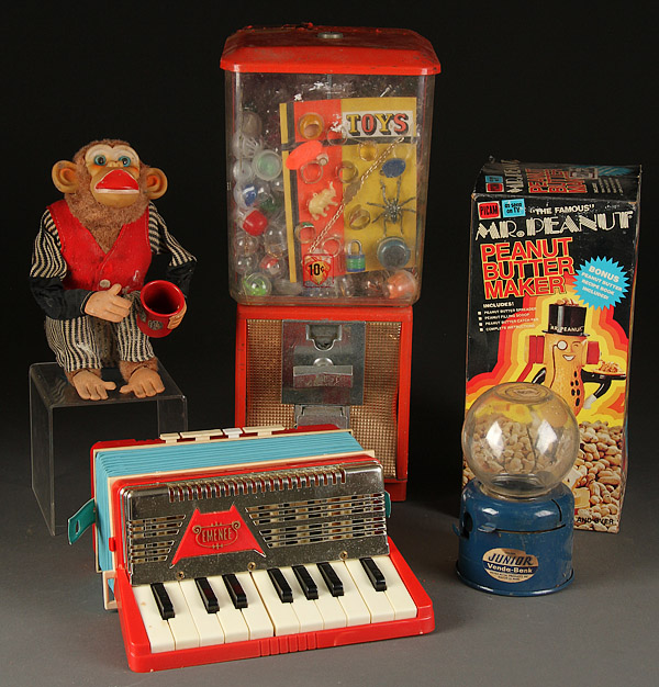 FIVE VINTAGE TOYS, MID 20TH CENTURY. Comprising a Northwestern 10 cent novelty plastic egg dispenser, a Junior Venda-Bank bubble gum dispenser, a Cragstan battery-operated monkey craps shooter, a toy accordion and a Mr. Peanut butter maker. The largest 17.5 inches (44.5 cm).