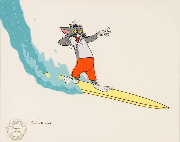 AN ORIGINAL ANIMATION CELL, TOM AND JERRY, M.G.M. 1964, CHUCK JONES. "Tom Riding a Surfboard," contained in a glazed frame, 9.2 inches x 11.75 inches (23.5 x 29.8 cm).