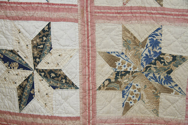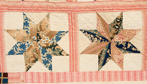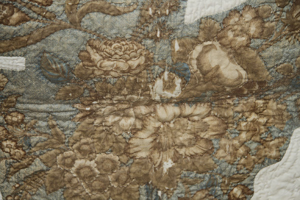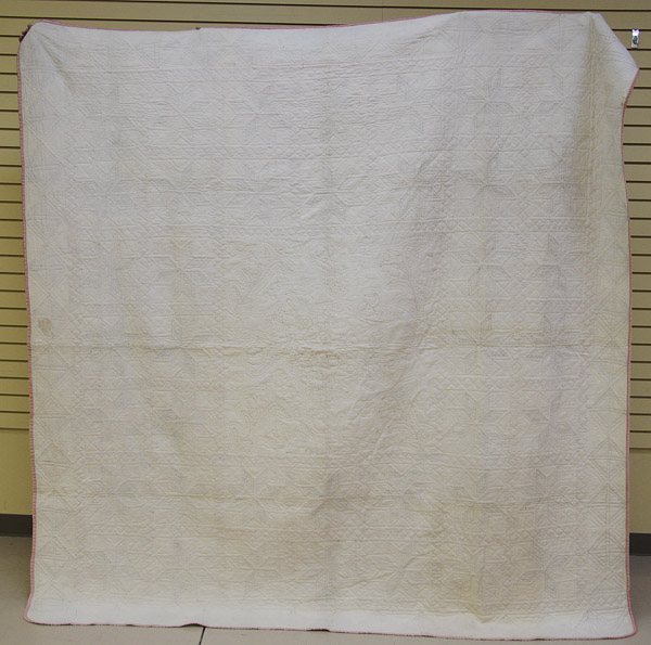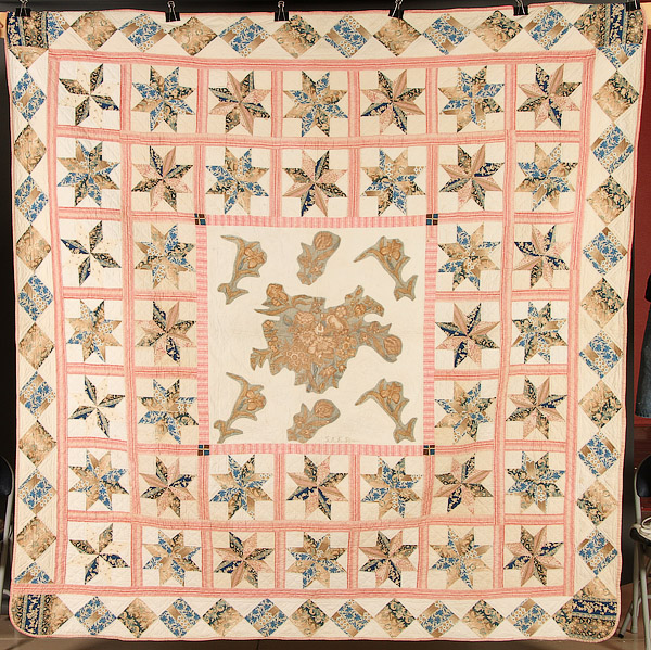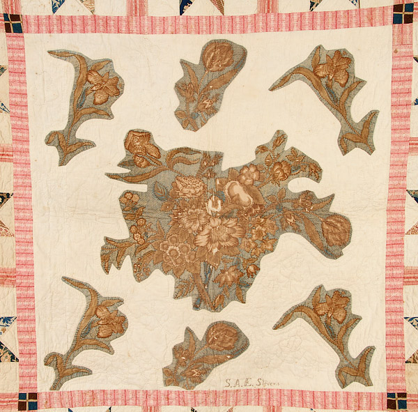 A GOOD 19TH CENTURY BRODERIE PERSE APPLIQUE QUILT, CIRCA 1840. With a central panel of cut out and applied florals within blocks of eight point stars, signed in center “S.A.E. Stevens”. 91 inches x 91 inches (231 x 231 cm).
