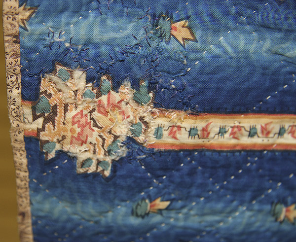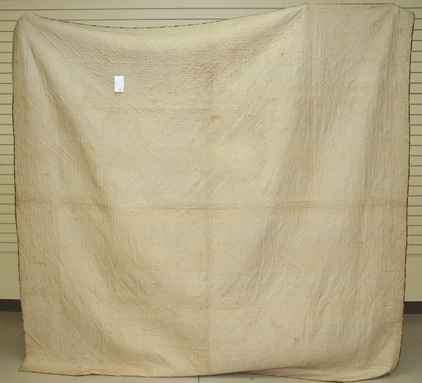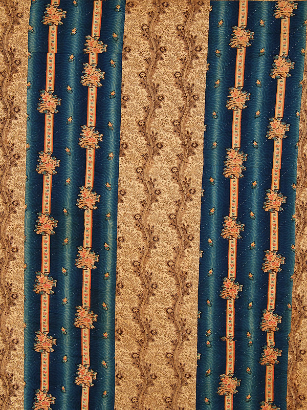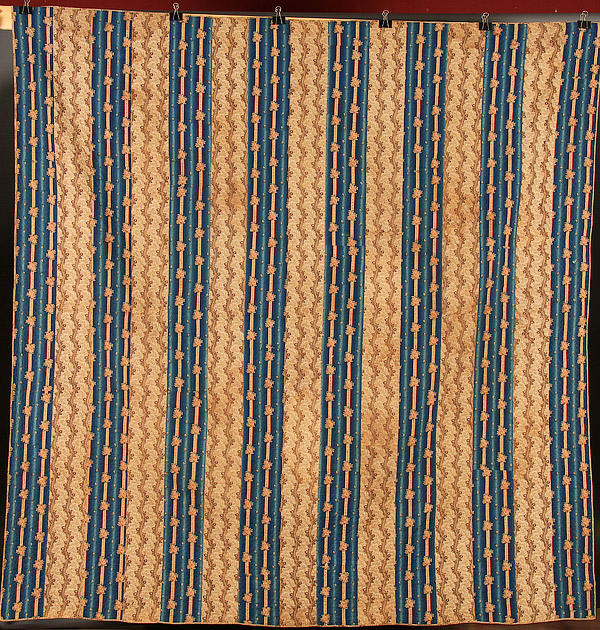 A FINE EARLY AMERICAN OMBRE PATTERN QUILT, CIRCA 1830-40. With alternating bands of undulating brown and tan floral and Prussian blue ombre, 91 inches x 92 inches (231 x 233.5 cm).