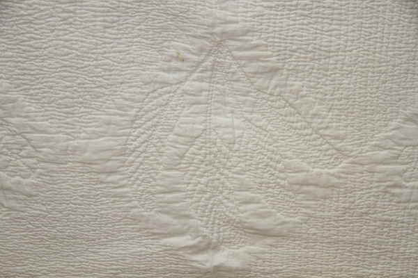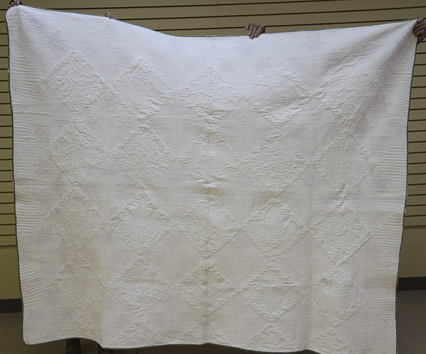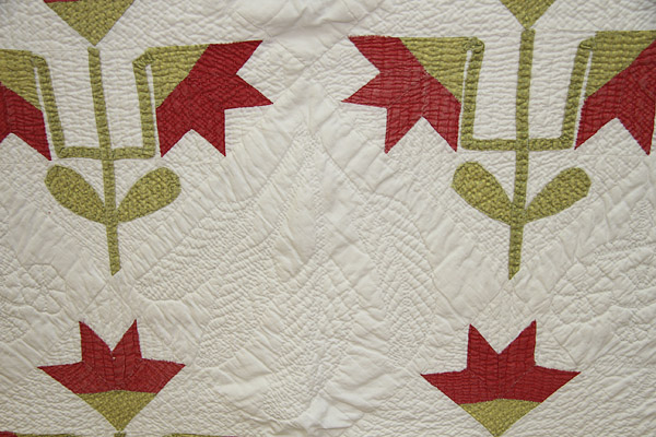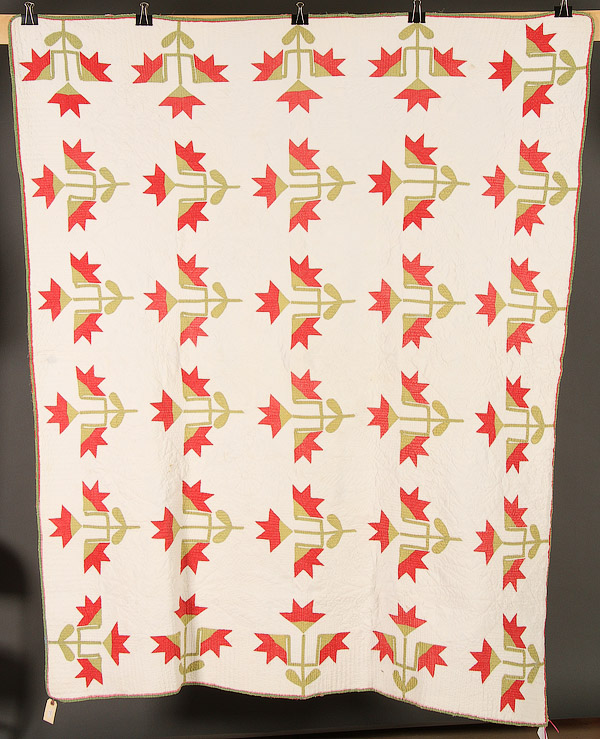 A 19TH CENTURY RED LILY PATTERN QUILT, 3RD QUARTER 19TH CENTURY. With stylized red and green florals, with a floral quilted field.68 inches x 83 inches (173 x 211 cm).