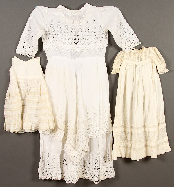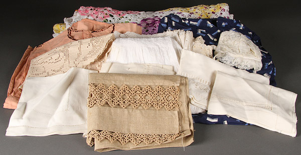 A LARGE VINTAGE TEXTILES AND LACE GROUP, LATE 19TH/EARLY 20TH CENTURY. Over 50 pieces including a crocheted bedspread, lace tablecloth, doilies of various size, lace Christening dresses and a very fine silk parlor table cover embroidered with polychrome silk florals and silver and gilt metallic threads.