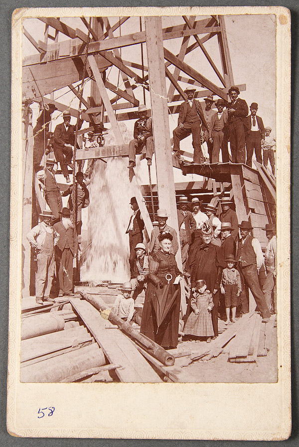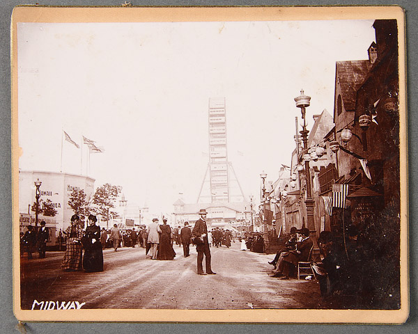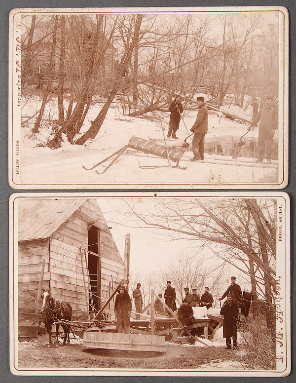 FOUR 19TH CENTURY ICE CUTTING, WELL DRILLING, AND 1893 COLUMBIAN EXPOSITION MIDWAY ALBUMEN CABINET CARD PHOTOGRAPHS. Four exceptional period images comprising a very fine view of the 1893 Columbian Exposition Midway Plaisance with the Vienna Café and ferris wheel center background, the "Panorama of Kilavea" building on the left and "Old Vienna" buildings on the right, a good sharp well exposed image with studio back stamp of "C. Soresen, Cedar Falls, Iowa", 4.25 inches x 5.25 inches (11 x 13 cm) overall; a good image of a gushing well head with posed onlookers among the derrick and later inscribed on verso "possible picture, flowing well across road from Claim-Kimball S. Dak" 6.5 inches x 4.25 inches (16 x 11 cm) overall; and a series of two ice cutting scenes depicting cutters with ice saws on river, and loading blocks into ice house. Both partially obscured photo artist name, probably T.M. Askren. 4.25 inches x 6.5 inches (11 x 16.5 cm) each.