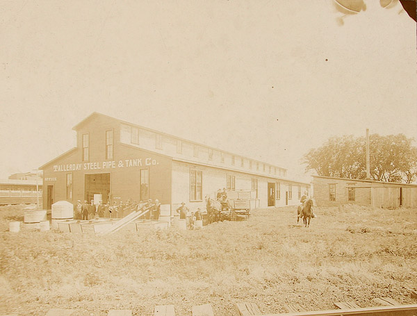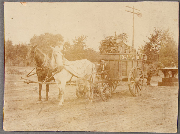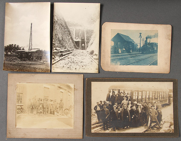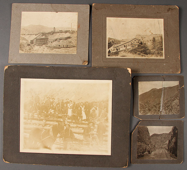 12 MINING, LOGGING AND WESTERN SCENE OUTDOOR PHOTOGRAPHS, LATE 19TH CENTURY. Including a calotype Elmwood Train Depot, a train tunnel construction site, a deep well rig, a horse drawn wood hauler's wagon named Egon & Bow, a Pikes Peak railway car with passengers dated 1909, a Talledary Steel Pipe and Tank Company warehouse and a fine image of the Calumet and Arizona copper mine in Bisbee, Arizona. The largest 8 inches x 10 inches.