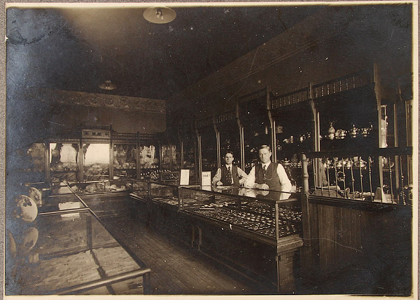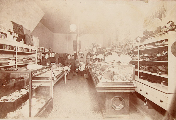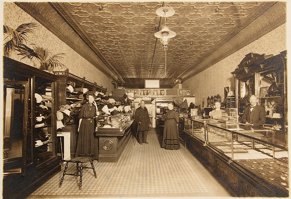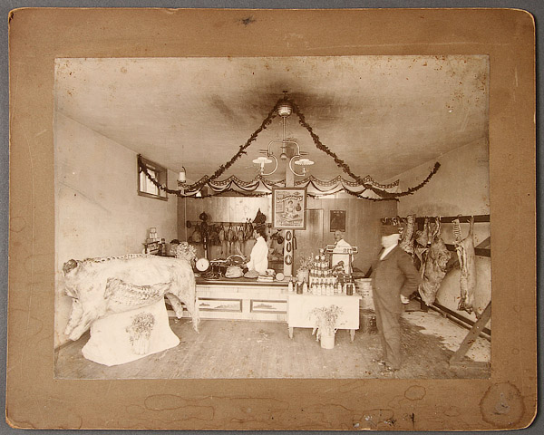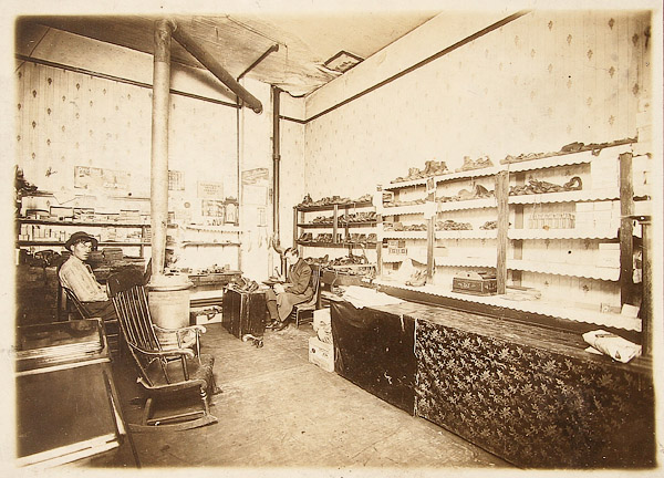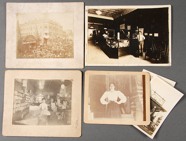 19 EARLY COMMERCIAL STOREFRONT INTERIOR AND OFFICE SCENE PHOTOGRAPHS, LATE 19TH/EARLY 20TH CENTURY. Albumen and silver gelatin with subjects including a cigar store, filling station exterior, 1899 Waterloo Young Brothers' War Show, a dry goods and notions store interior and exterior, a jewelry and china shop interior, a millinery interior, a shoe shop with cobbler interior, a meat market interior, a National Biscuit Company sales meeting and other interior office scenes. Up to 8 inches x 12 inches.