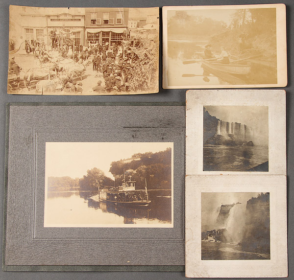 15 EARLY OUTDOOR SCENE, BOATING AND PARADE PHOTOGRAPHS, LATE 19TH CENTURY. The majority mounted on studio cards including four different views of Niagara Falls, a bird's eye view of a presidential train stop, paddlewheel excursion boats and other images. The largest 8 inches x 10 inches.