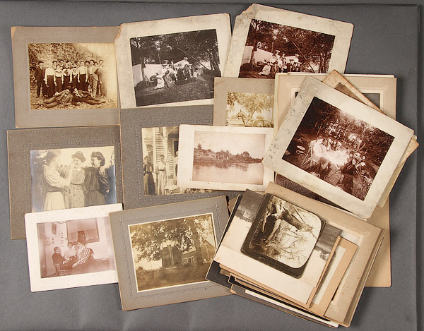58 EARLY HUNTING, OUTDOOR SCENES, PICNIC AND OTHER PHOTOGRAPHS, CIRCA 1900. Including scenes of men and women shooting shotguns, women fishing, hunting camp scenes, outdoor picnics and family porch groupings. The majority mounted on studio cards. The largest approximately 4 inches x 5 inches.