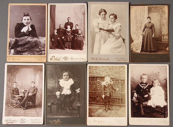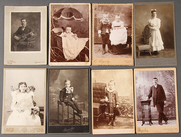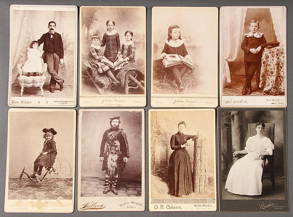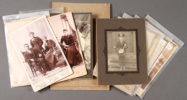 36 CABINET CARD PORTRAIT PHOTOGRAPHS, LATE 19TH CENTURY. The majority albumen prints and better quality studio settings including children, family groups, a girl with photo album, a Scotsman with kilt, a young girl on velocipede, a man with guitar, a G.A.R. veteran, a young drummer boy and others with various studio stamps including E. E. Mills, Sheridan, Wyoming.