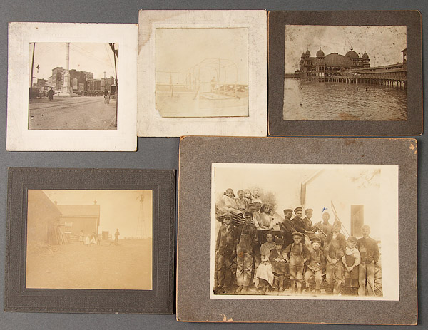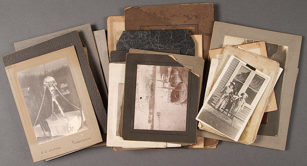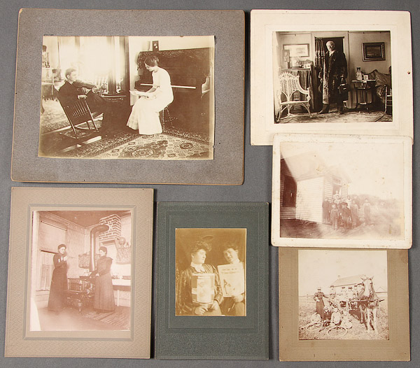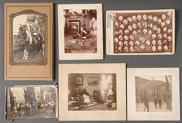 OVER 50 INTERESTING AND UNIQUE EARLY PHOTOGRAPHS, LATE 19TH/EARLY 20TH CENTURY. Including albumen prints and cabinet cards. The majority better than average or with unique subjects including a studio photographer's montage of baby portraits, a young boy mounted on a horse in a studio setting, a baby with a violin, a family dinner, 1898 Iowa Senate montage, a young child on pony dressed as a cowboy, two women at iron cook stove, country doctor with fur coat in parlor setting, school children dressed as Indians and a young Jewish boy in studio.