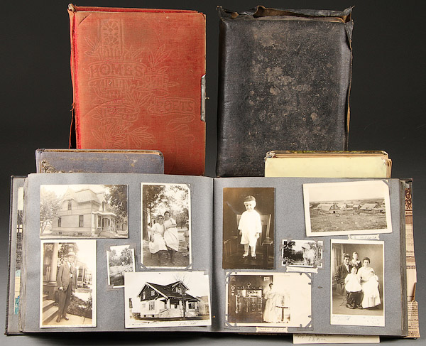 FIVE VINTAGE PHOTOGRAPH AND POSTCARD ALBUMS CONTAINING OVER 600 PHOTOGRAPHS OF A VARIETY OF SUBJECTS AND SCENES, LATE 19TH/20TH CENTURY. With one album primarily filled with real photo postcards (adhesive mounted), including a great variety of period scenes with some retail and advertising and also including early amateur snapshots with good content together with three portraiture albums with cabinet card and carte d'visite portraits and a portrait album later used as a scrapbook with a large variety of pasted real photo postcards, early portraits, architectural commercial storefronts and other subjects.
