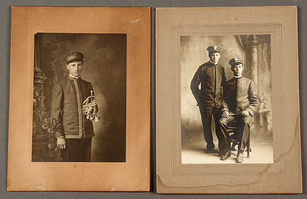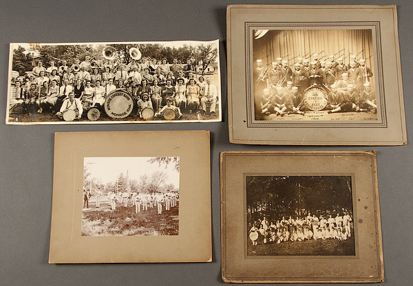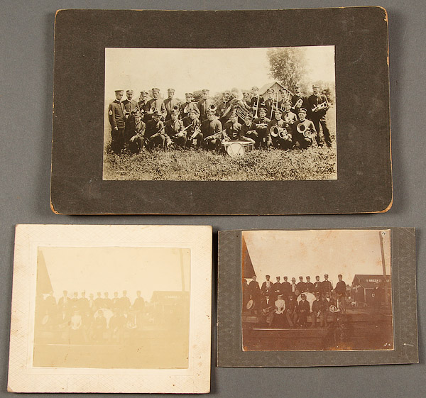 NINE EARLY BANDS AND MUSICIANS PHOTOGRAPHS, EARLY TO MID 20TH CENTURY. Including a large named U.S. Naval Training Station, Great Lakes, Illinois, an unidentified army band, Scranton Boys' Booster Band, a cadet band at the Green Bay Railroad Depot and a Monroe, Iowa Community Band. The largest 6.75 inches x 16.75 inches.