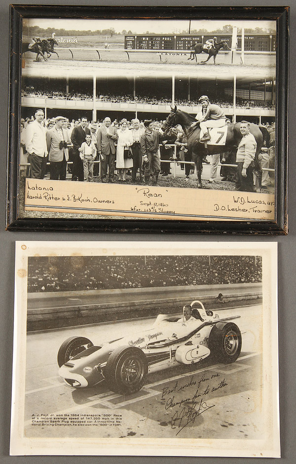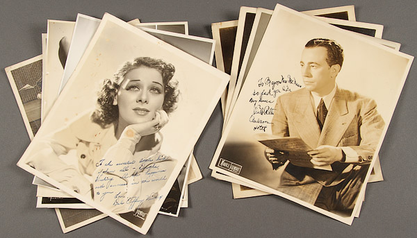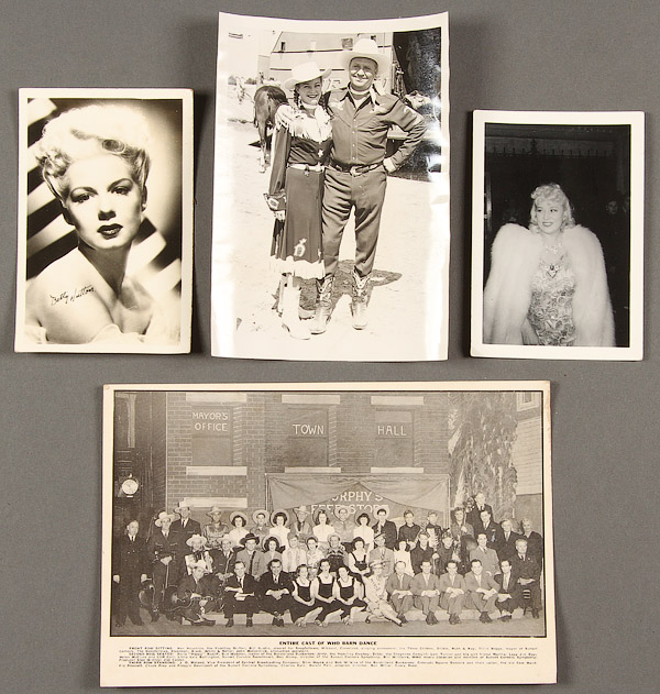 40 SILVER GELATIN CELEBRITY AND THEATRICAL RELATED PHOTOGRAPH STILLS, EARLY TO MID 20TH CENTURY. Including two snapshots of Gene Autry and Gail Davis, a snapshot of Mae West, promotional stills of minor actors by Dick Whittington and Romaine, and an inscribed autograph still of Emil Petti and Dale Tiffany Winthrop. Together with various vaudeville and stage acts; a photograph of A.J. Foyt Jr. with Formula One car; and a photograph of a race horse titled "Rean at Latonia". Various sizes and condition, some with losses. Up to 9.5 inches x 13 inches.