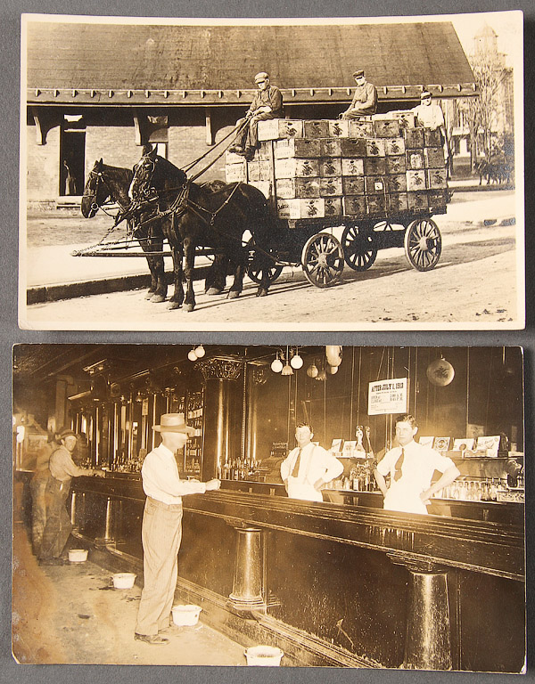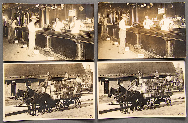 SIX REAL PHOTO POSTCARDS, SCHLITZ BEER AND SALOON INTERIORS, EARLY 20TH CENTURY. Comprising three well exposed and detailed identical images of an Anheuser Busch beer wagon and three of a well-appointed tavern interior. All unmailed on Azo backs. Various conditions.