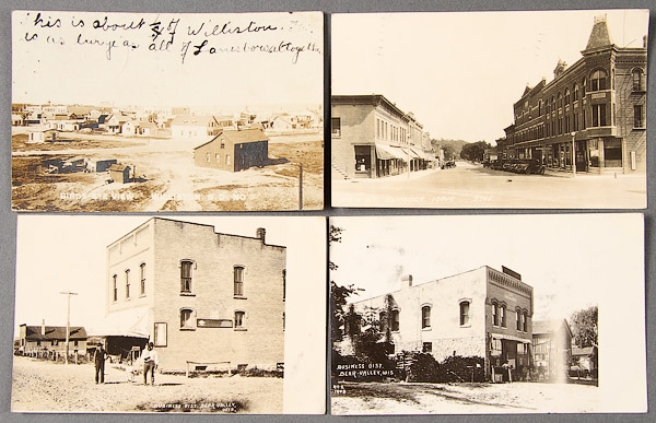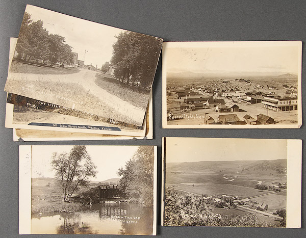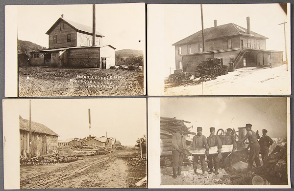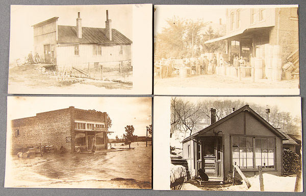 22 REAL PHOTO POSTCARDS, EARLY STREET SCENES AND COMMERCIAL BUSINESS EXTERIORS, EARLY 20TH CENTURY. Comprising six scenes of Bear Valley, Wisconsin including feed mill, general store and blacksmith shop, three saw mill scenes, Oklahoma post office in flood water and views of Sundance, Wyoming; Toronto, South Dakota; Mitchell, Iowa; Whiting, Kansas and others. Various conditions.