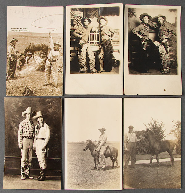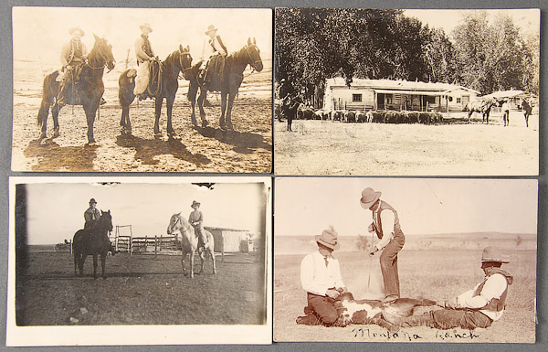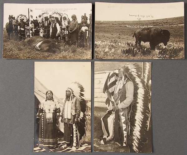 14 REAL PHOTO POSTCARDS, NATIVE AMERICAN INDIANS, WESTERN COWBOYS, EARLY 20TH CENTURY. Including Geronimo carving buffalo meat and cowboys at home by Martin, a log house with sheep herd and cowboys branding calf by Cameron, Fallon, Montana and others. Various condition.