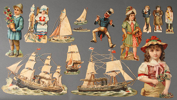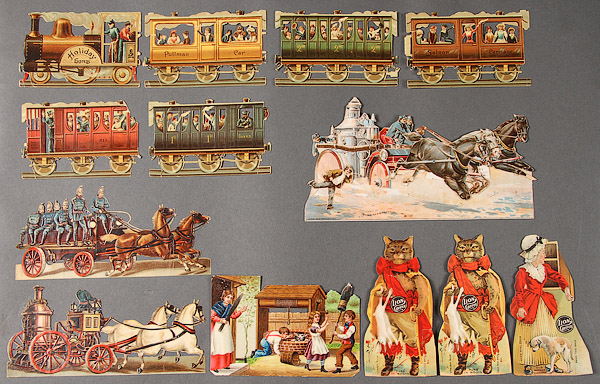 A 35 PIECE GROUP OF VICTORIAN DIE CUT LITHOS AND ADVERTISING. Comprising two 9.5 inch figures, six ships (the largest 11 inches), McLaughlin's Coffee figures with clothing, three fire wagons (the largest 9 inches), a six piece Holiday Express train and three Lion Coffee advertising figures together with other items, some minor losses.
