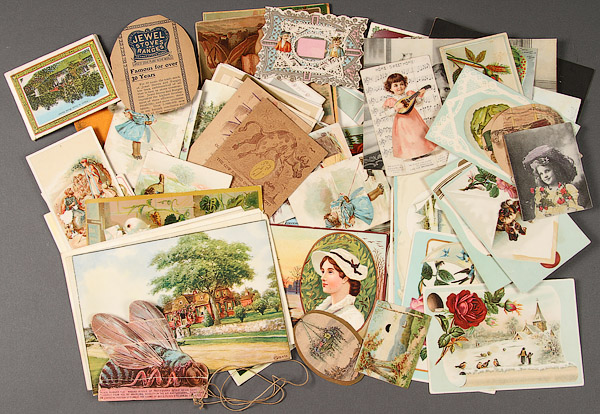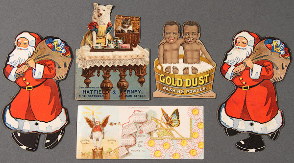 A VERY FINE VICTORIAN TRADE CARD, ADVERTISING AND LITHO GROUP. Over 300 pieces including Gold Dust twins, an 1890 Moline Plow pocket calendar, die cuts including two mechanical walking Santas, a large Panama Coffee World's Fair card, Acorn Stoves 1894 calendar die cut, Little Bo Peep Fuzzy Wuzzy storybook and many other items. Various condition, shown partially illustrated.