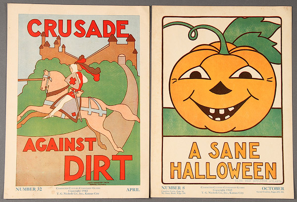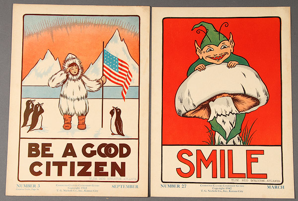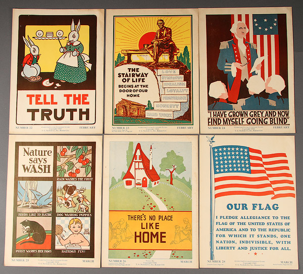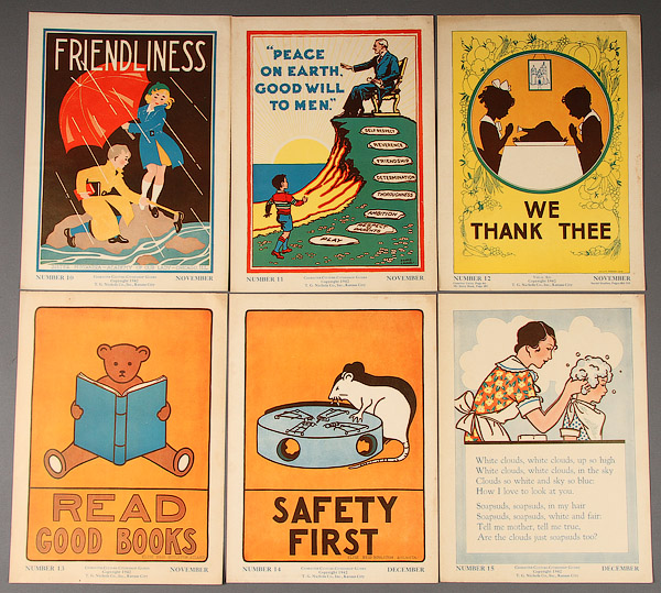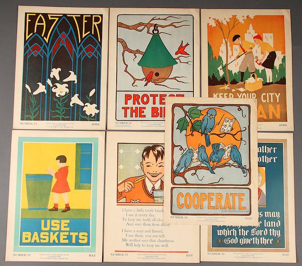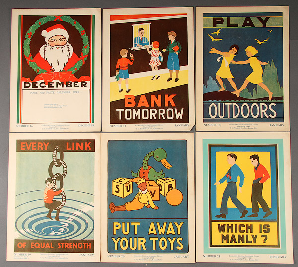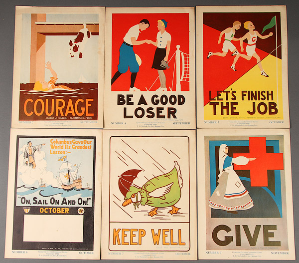 A RARE CHARACTER CULTURE CITIZENSHIP GUIDES COLLECTION, 1942, T.G. NICHOLS COMPANY, KANSAS CITY. 51 pieces with three to five each for the months of January, February, March, April, May, September, October, November and December. Each with interesting and unique illustrations depicting various motivational, inspirational and educational messages regarding moral character, health and hygiene. Some signed by the illustrators Elise Reid Boyston, George J. Keller, Janet Katherine Smith and others. Shown partially illustrated, 16.5 inches x 12 inches (42 x 30.5 cm). For a similar group, see Swann Galleries, August 4, 2004, Lot 85.