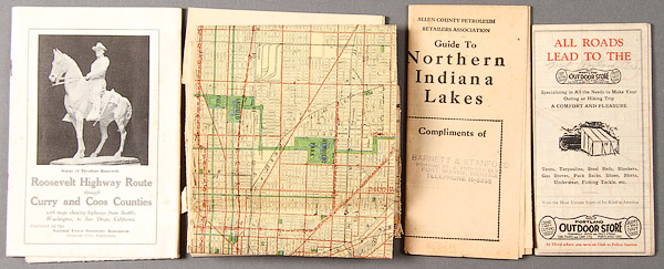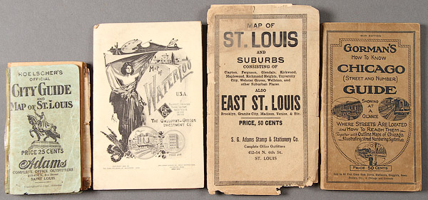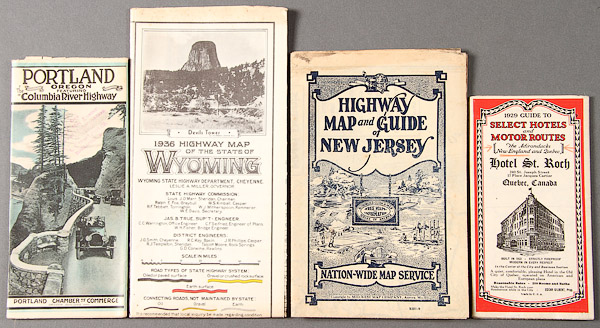13 EARLY TRAVEL MAPS AND CITY GUIDES, CIRCA 1900 AND LATER. Comprising Gorman's 1925 Chicago Street Guide, Koelscher's City Guide and Map of St. Louis, two Chicago Steam Railway mapS, a Galloway 1908 map of Waterloo, Iowa, an early New Jersey highway map, 1936 Wyoming map, an early Portland, Oregon map, 1929 Adirondacks hotel and road guide and others.