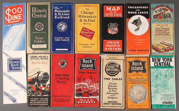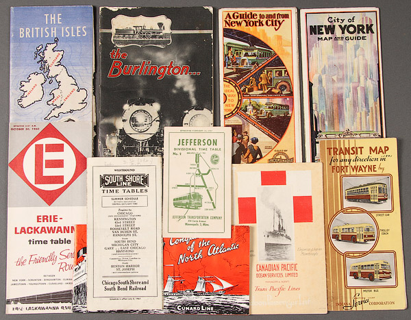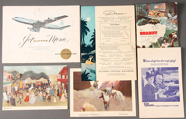 OVER 100 RAILROAD, TRANSIT AND STEAMSHIP LINE TIMETABLES AND MENUS, EARLY TO MID 20TH CENTURY. A large variety of material including a 1919 Aquatania meal card, Chessie items, 1952 Braniff souvenir flight packet, Pullman menu, Fred Harvey menus, 1918 Cunard celluloid calendar with scene of the Aquatania, a 1919 Cunard Peace Day booklet, an oriental steamship brochure (circa 1913), a Pan-American Jet Clipper menu and other items, shown partially illustrated.