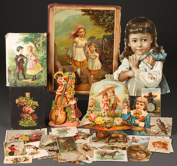A COLLECTION OF VICTORIAN DIE CUT LITHOS AND TRADE CARDS, LATE 19TH/EARLY 20TH CENTURY. Over 100 pieces including some Continental postcards, partially illustrated. The largest 13 inches.
