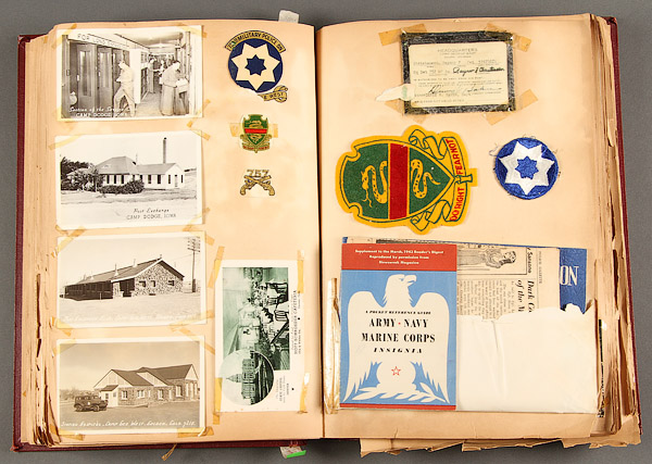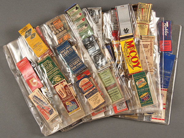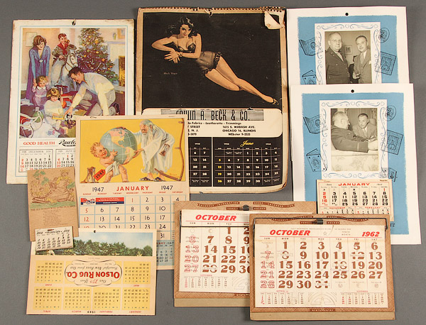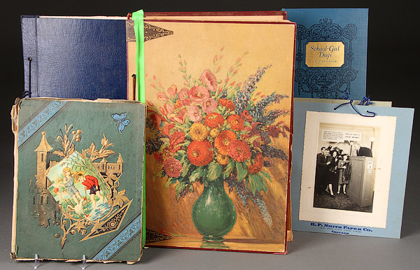 A VINTAGE CALENDAR SCRAPBOOK AND MATCHBOOK COLLECTION, EARLY TO MID 20TH CENTURY. Comprising a First National Bank, Dennison, Iowa lithographed tin and paper calendar; over 100 vintage advertising matchbooks, assorted advertising calendars; a large scrapbook with postcards; news clippings; baby memorabilia and militaria; a Victorian scrapbook with pasted die cuts and a "School Girl Days" memory book, 1910, Reilly and Lee Company, partially illustrated.