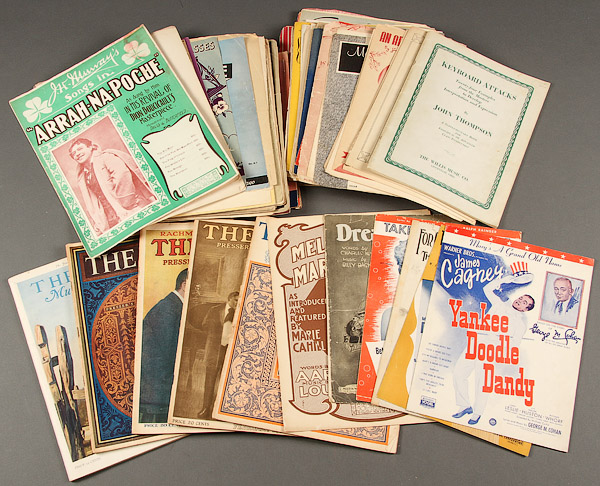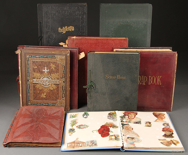 A COLLECTION OF SCRAPBOOKS, SHEET MUSIC AND MAGAZINE ADVERTISING CUTS, EARLY TO MID 20TH CENTURY. With ten scrapbooks containing vintage greeting cards, die cuts and other items, large variety of sheet music, advertising magazine cuts for framing and Victorian litho reproductions, partially illustrated.