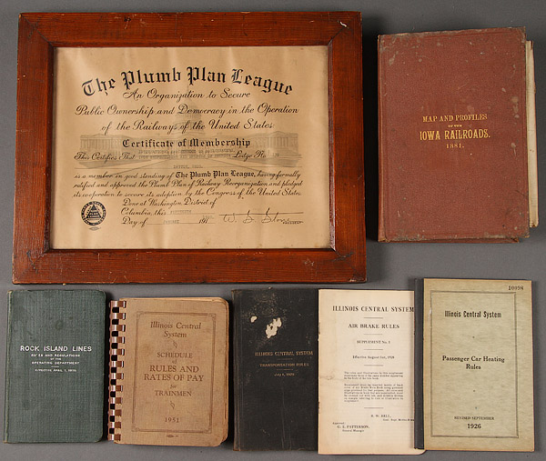 AN 1881 IOWA RAILROAD MAP AND PROFILE BOOK. Together with Illinois Central Transportation Rules and Passenger Car Heating Rules books for 1928 and 1926, an Illinois Central 1951 Trainmen's Rules and Pay Schedule, a 1910 Rock Island Lines regulations book and a Brotherhood of Boilermakers and Iron Shipbuilders Plumb Plan League Certificate for 1920.