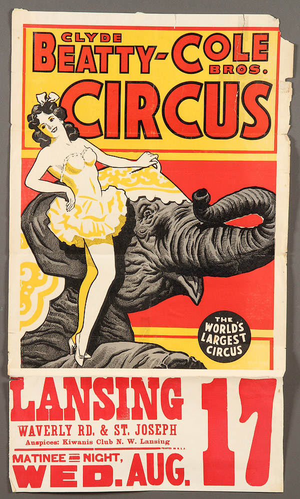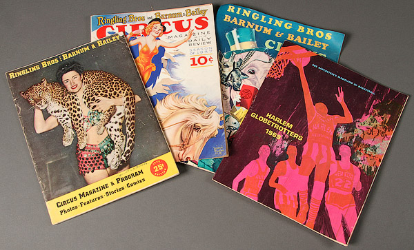 A CIRCUS, ICE FOLLY AND ENTERTAINMENT EPHEMERA GROUP, MID TO LATE 20TH CENTURY. Over 20 pieces including Beatty-Cole circus poster, 1954 Ice Vogue placard, Circus World Museum poster, a 1961 Kelly and Miller poster, Ringling Brothers 1937, 1946 and 1960 programs, Harlem Globetrotters 1969 magazine plus vintage circus poster reprints and other items.
