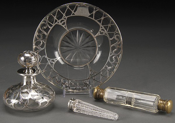 A STERLING OVERLAY CRYSTAL PERFUME BOTTLE, EARLY 20TH CENTURY. Together with a cut glass double perfume bottle, a small sterling lidded pendant perfume bottle and a sterling overlay underplate. Diameter 6 inches (15 cm).
