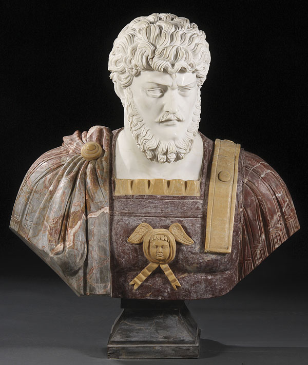A LARGE LIFE SIZED CARVED MARBLE BUST OF A ROMAN STATESMAN, 20TH CENTURY. Well carved in three types of marble, white marble head with detailed curly locks and well sculpted facial features set in a rouge marble shoulder with honey colored marble accoutrements. Height 35 inches (89 cm).