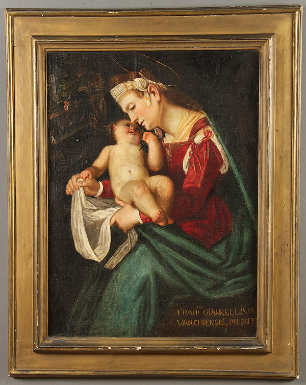 OLD MASTER PAINTING, ITALIAN SCHOOL, 18TH CENTURY. Madonna and Child, oil on canvas, inscribed lower right “Francus Giannellius Varchiensis Pinxit”, 33.4 inches x 24.4 inches (84.8 x 62 cm).