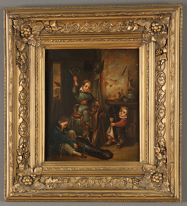 A 19TH CENTURY PAINTING OF CHILDREN, PROBABLY DUTCH, CIRCA 1890. Depicting a stable interior with children playing on a saddle and trying on riding boots, oil on metal, apparently unsigned. 10.25 inches x 8.75 inches (26 x 22 cm).