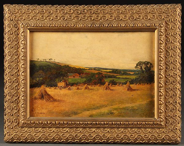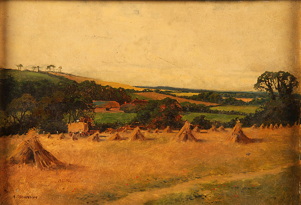 A SIGNED BRITISH LANDSCAPE OIL PAINTING, H. STANTON. Depicting a harvest scene, oil on panel, signed lower left and inscribed on verso. 7 inches x 10 inches (18 x 25 cm).