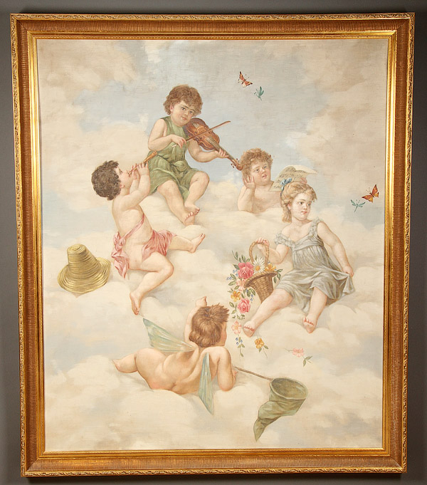 A LARGE OIL PAINTING OF PUTTI, CIRCA 1890. Depicting putti amongst clouds with various attributes, oil on sail cloth, apparently unsigned. 65.75 inches x 55.25 inches (167 x 140.3 cm).
