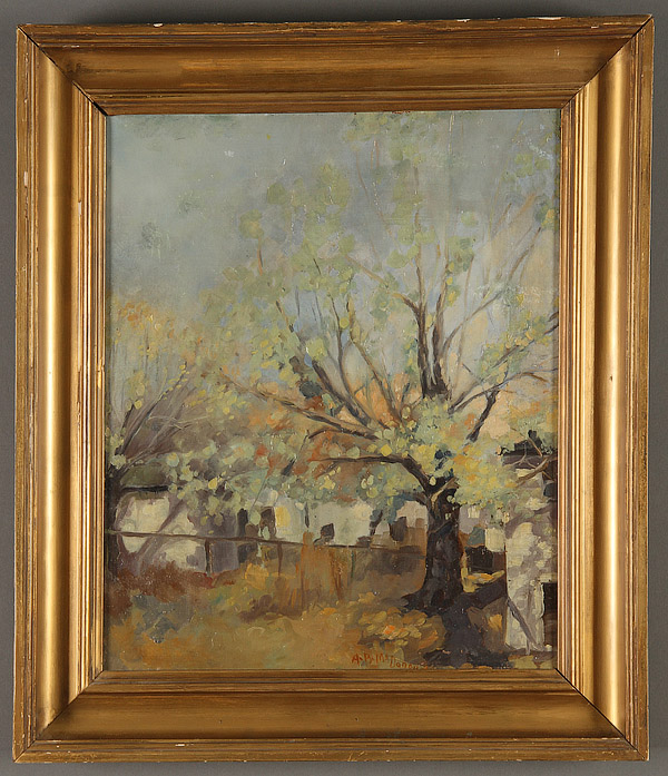 A VINTAGE SIGNED IMPRESSIONISTIC LANDSCAPE PAINTINGS, CIRCA 1910. Depicting a spring landscape with tree and buildings, oil on canvas, signed lower right A.B. Donough. 17 inches x 14 inches.