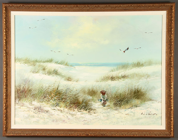 A PAIR OF LARGE LANDSCAPE OIL PAINTINGS, 20TH CENTURY. Comprising a sand dune/beach scene with child playing, oil on canvas, signed lower right W. Bridy, 30 inches x 40 inches (76.2 x 101.6 cm); together with a wooded cottage along a stream, oil on canvas, signed lower right L. Steele. 27.75 inches x 35.5 inches (70.5 x 88.9 cm).