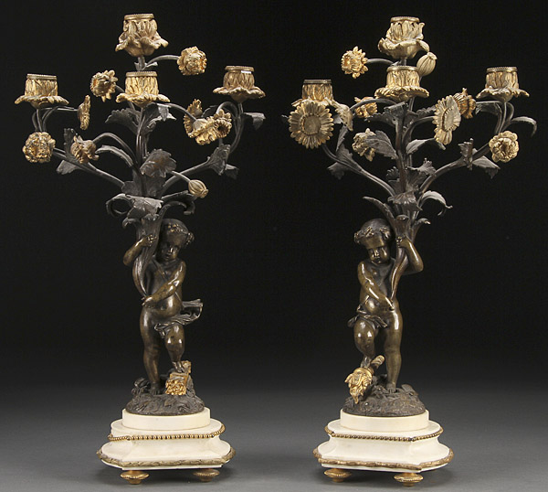 A PAIR OF FRENCH LOUIS XV STYLE BRONZE AND MARBLE MOUNTED FIGURAL PUTTI CANDELABRA, FIRST HALF 19TH CENTURY. Depicting the standing figures, one with arrows, one with torch, grasping a lily form with extending scrolled foliates terminating in floral form candle sockets raised on shaped marble plinths with gilt bronze mounts. Height 17.75 inches (45 cm).